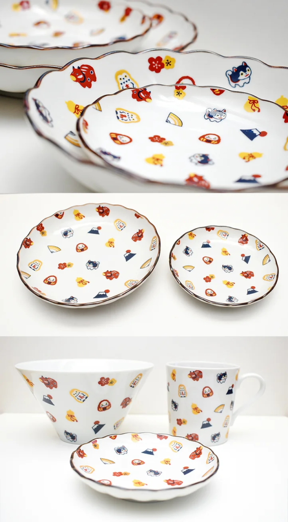 ヤマ吾陶器様から発売された食器「千縁」のイラストを担当いたしました。 平皿の他にもカップやラーメン小鉢もあります。 縁起物を中心にかわいらしい柄をちりばめた和食器です。 2021.11