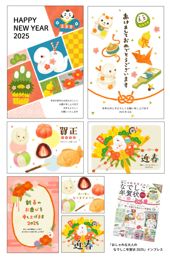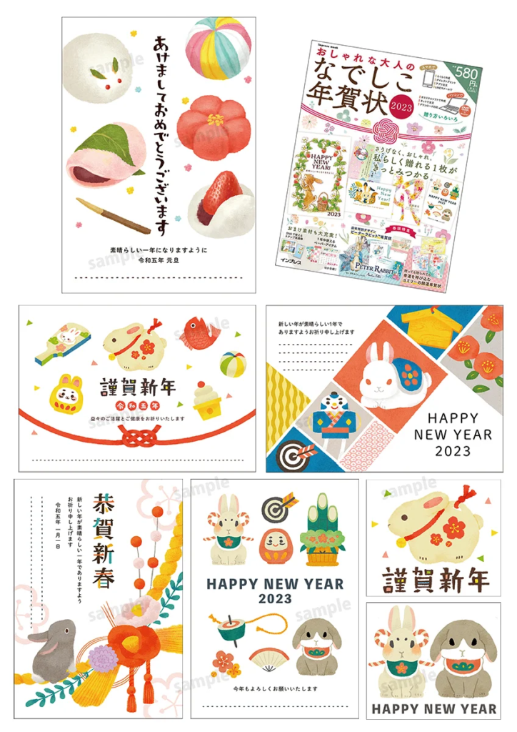 インプレス様より発売された「おしゃれな大人のなでしこ年賀状2023」に年賀状5種、LINEスタンプ風画像2種担当いたしました 2022.10